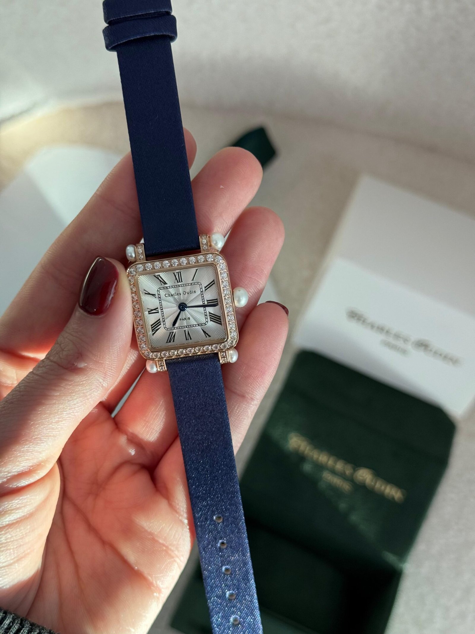 This Pansy Retro model showcases Charles Oudin’s unique approach to watchmaking, where artistry meets elegance. The pearl accents and delicate 24mm case create a refined silhouette, while the sleek black strap adds a contemporary contrast. It’s a timeless companion for women who appreciate understated luxury and impeccable detail.