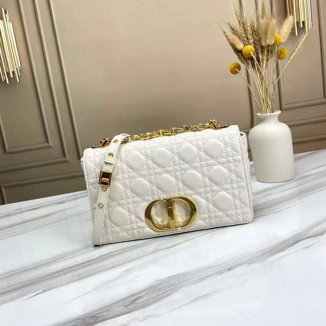 The front flap is secured by the eye-catching “CD” signature twist clasp, typically finished in antique gold or silver-tone hardware. The medium Caro includes a wide, removable leather shoulder strap and a detachable chain strap, offering multiple ways to carry the bag. The Dior Black Cannage Quilted Caro Bag is the definitive choice for pairing iconic French luxury with a beautifully structured, versatile design.
