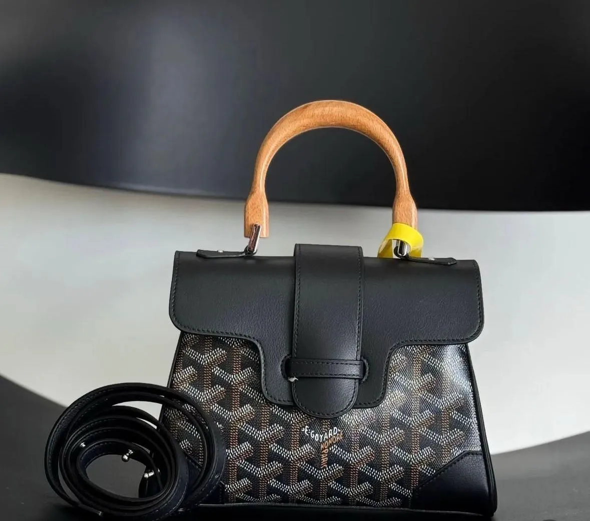Smooth black calfskin frames Goyard’s signature Goyardine coated canvas; tonal stitching keeps the lines clean and structured.