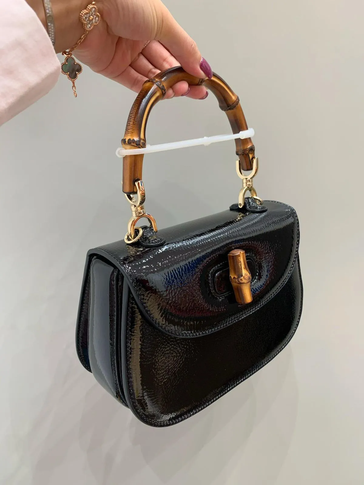 Compact Gucci Bamboo 1947 in black python with hand-carved bamboo handle and bamboo closure. Antique gold-toned accents and two detachable straps add easy styling.