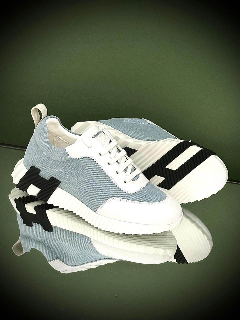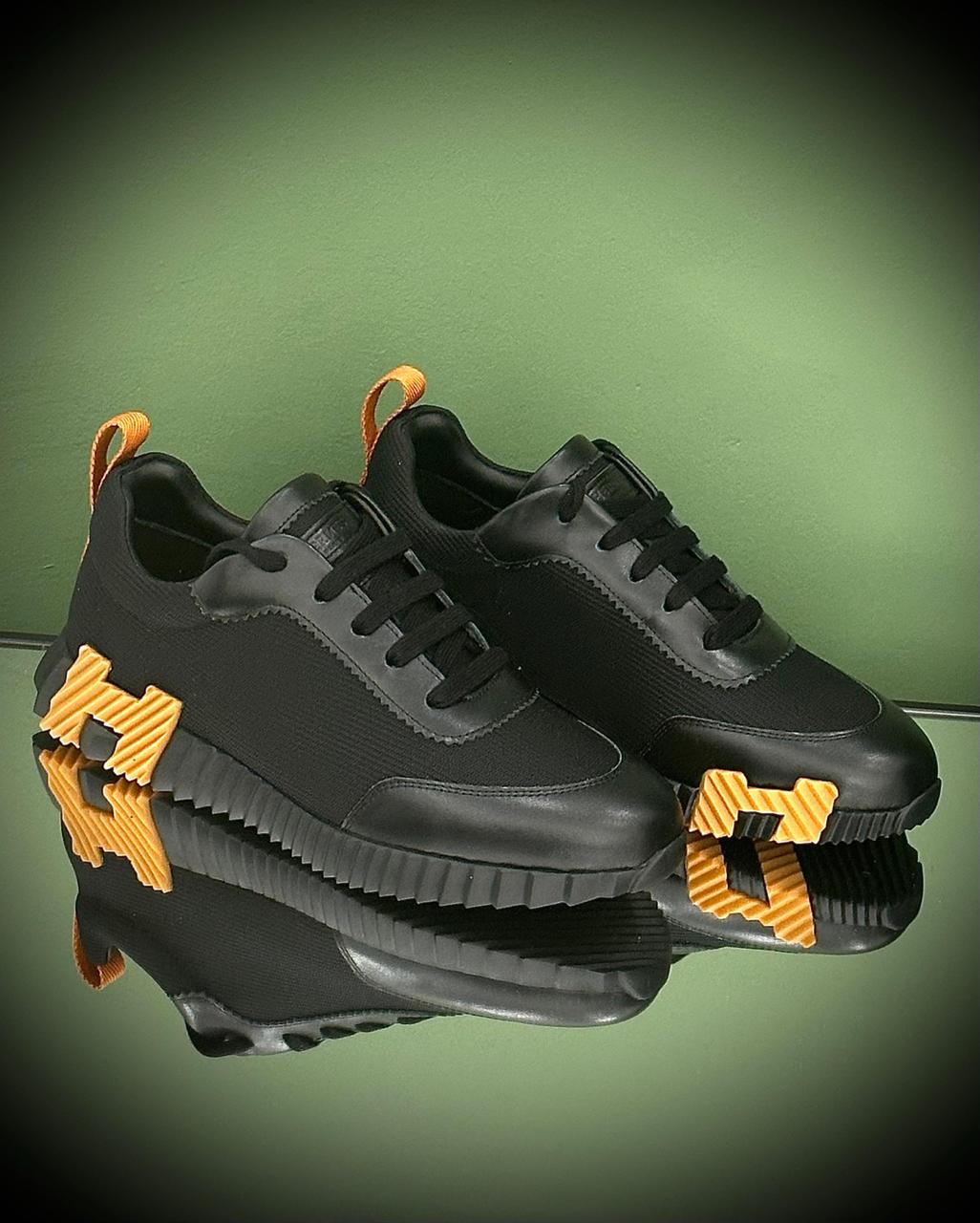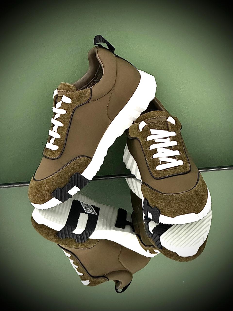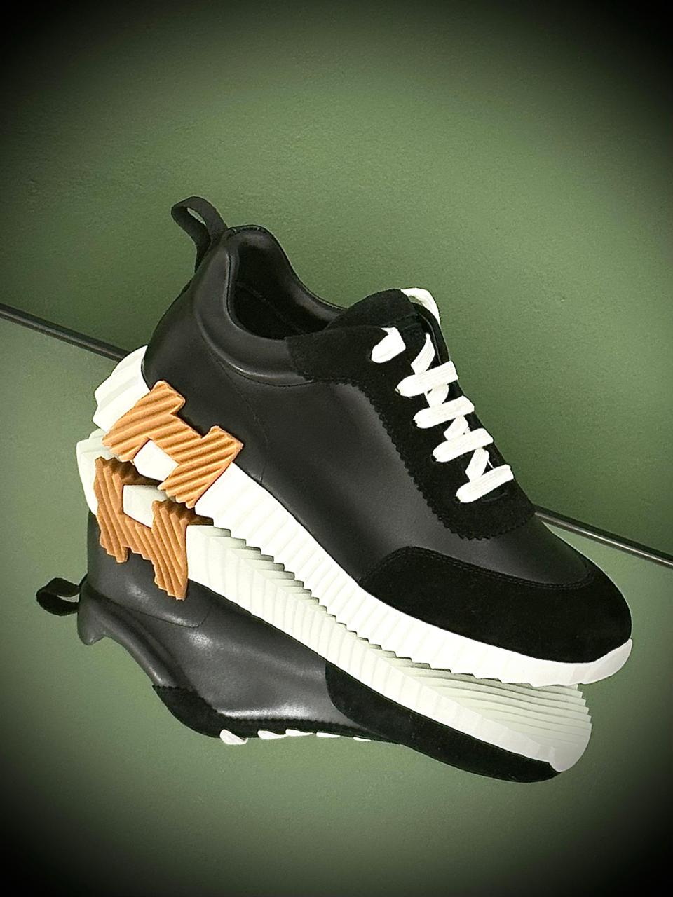 The Bouncing Sneaker is meticulously Made in Italy. It typically features a rich combination of materials, such as soft suede goatskin and plush calfskin leather or technical mesh. The design is clean yet bold, built on a unique, light rubber sole. This contrasting sole showcases the signature, oversized “H en biais” motif, which adds an unmistakable mark of luxury.