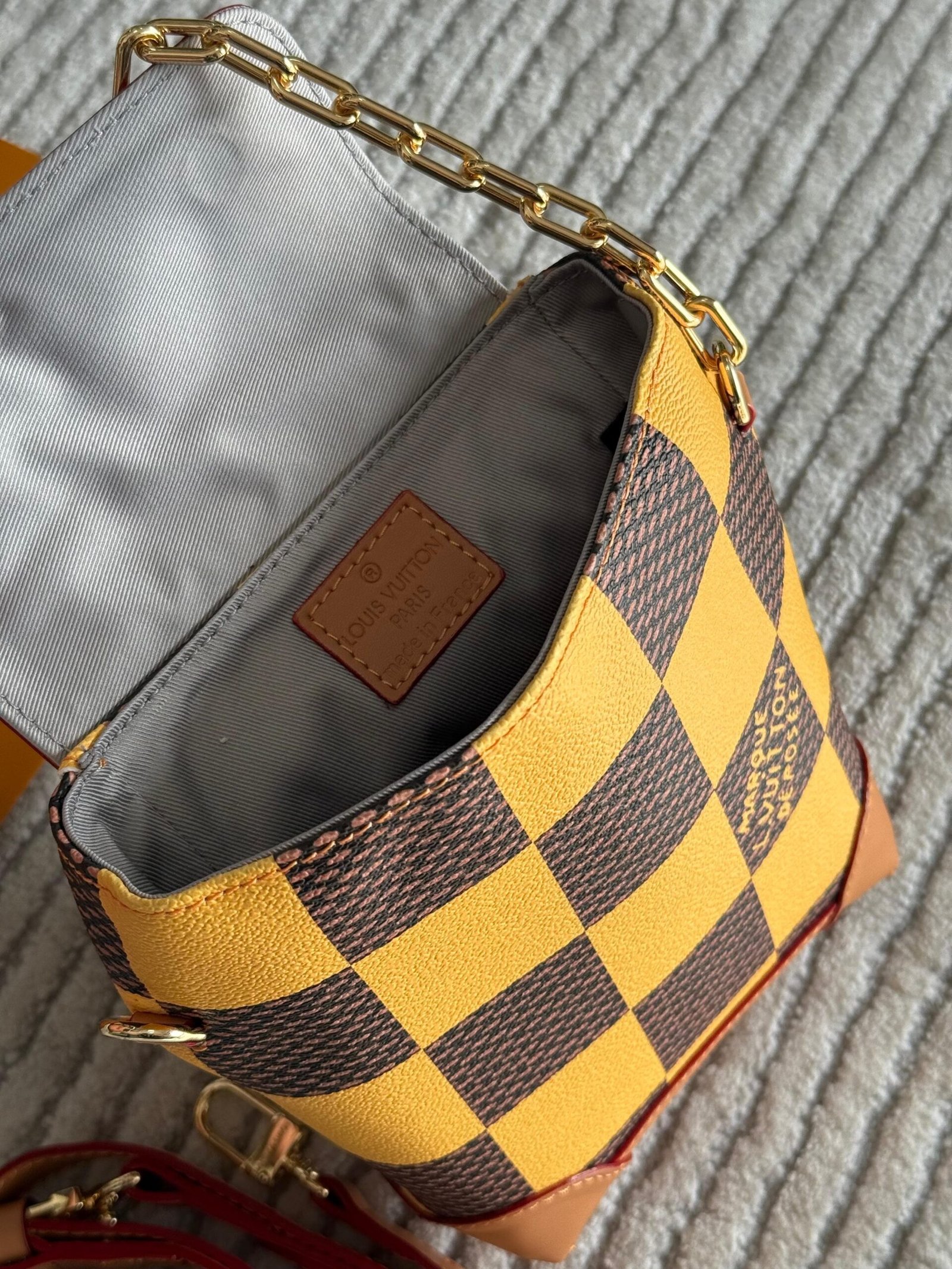 This chic cross bag is typically crafted from the beautiful Damier Ebène coated canvas. This durable material features the instantly recognizable brown checkered pattern, offering a more discreet alternative to the classic Monogram. The Croisette is defined by its elegant, structured shape and a distinctive S-lock closure—a detail inspired by Louis Vuitton’s historic trunks. The interior is spacious enough for essential items like a phone, wallet, and keys. It features a removable top handle and a removable, adjustable leather strap (or sometimes chain strap). This versatility allows it to be carried as a short shoulder bag, a clutch, or a convenient cross-body bag. The Croisette is a compact masterpiece of functionality and timeless design.