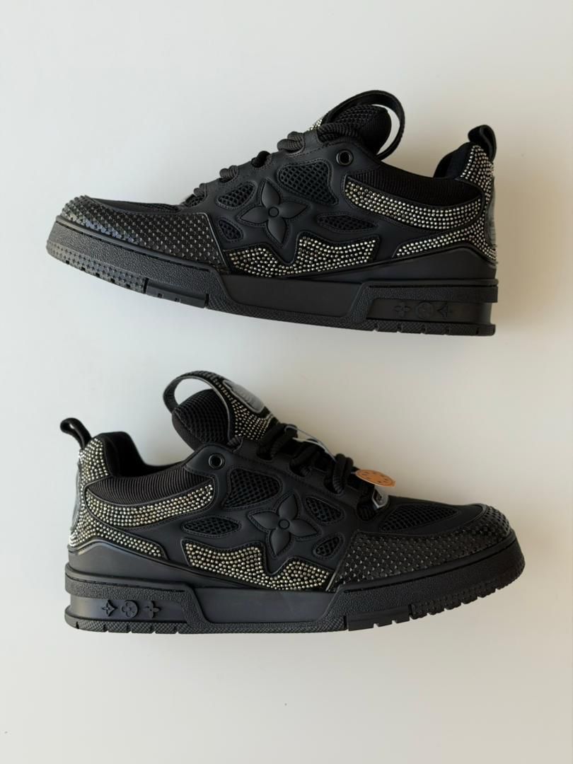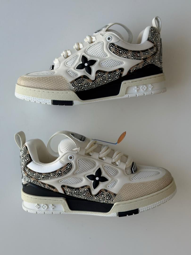 The LV Skate Sneaker is defined by its exaggerated proportions and intricate detailing. It often features a vibrant mix of materials, including calf leather and Monogram textile inserts. This construction provides durability and a rich, layered look. The oversized padded tongue and robust laces emphasize its authentic skate-shoe heritage.