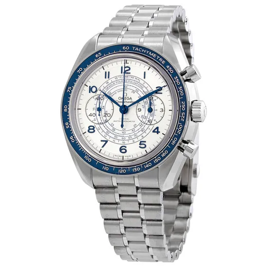 The Omega Speedmaster Chronoscope Co-Axial Watch is a remarkable timepiece that combines the legendary Speedmaster design with advanced chronograph functionality. Featuring a 43mm stainless steel case, this watch exudes a bold and sporty aesthetic while maintaining a refined elegance. The silver dial is beautifully detailed with three vintage-style timing scales—a tachymeter, pulsometer, and telemeter—allowing the wearer to measure speed, heart rate, and distance with precision. The blue leaf-shaped hands and Arabic numerals provide a striking contrast, ensuring legibility and adding a sophisticated touch to the dial. The bi-complex chronograph layout offers enhanced readability, staying true to Omega’s commitment to functional yet stylish watchmaking.