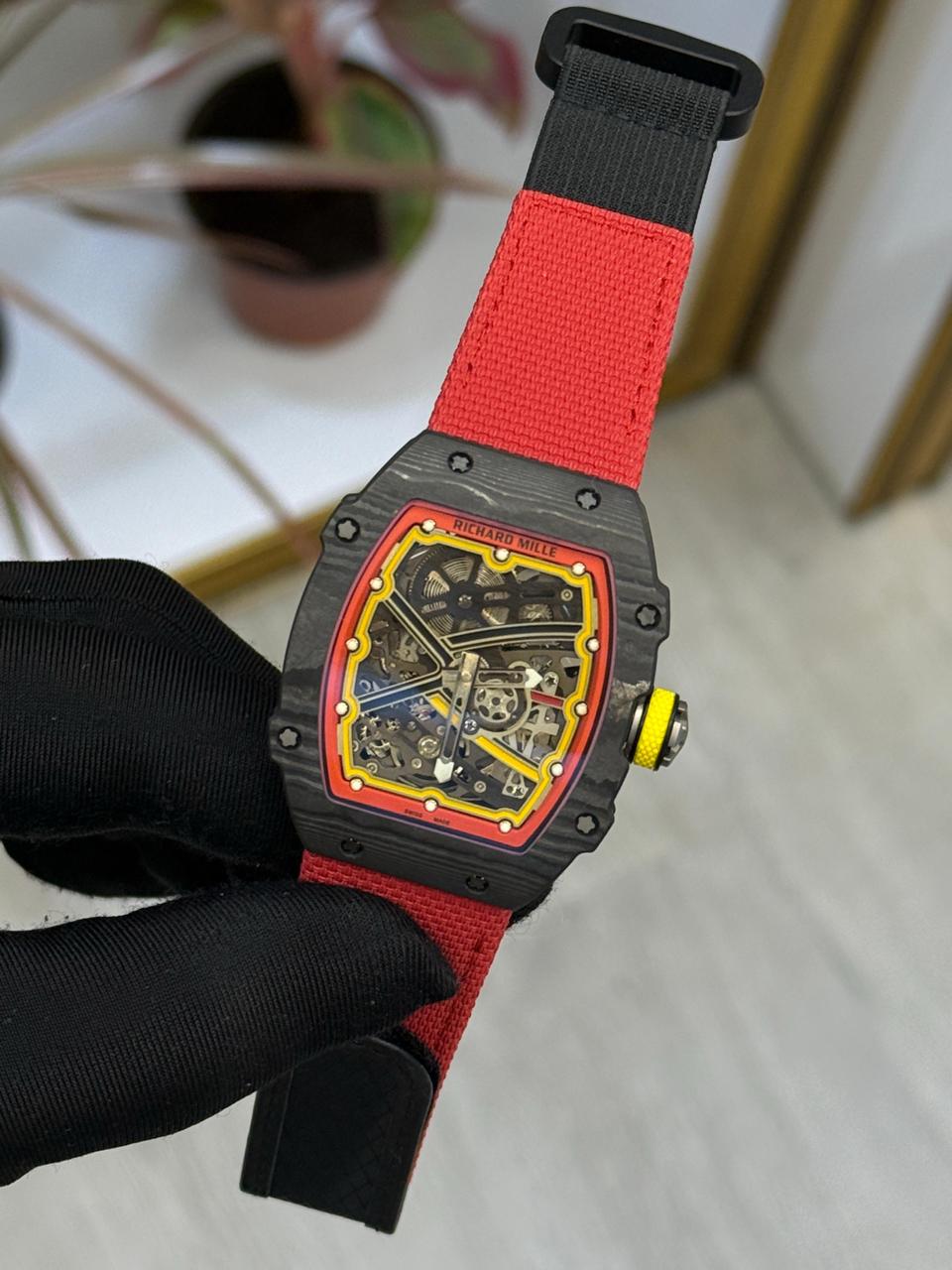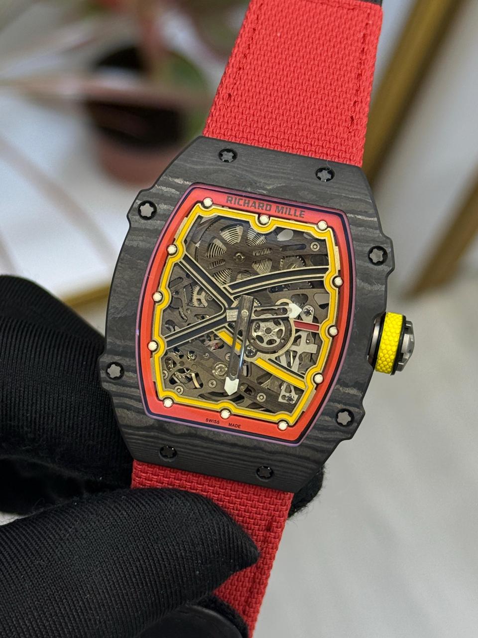 The RM 35-02 is the first in the Nadal collection to feature an automatic caliber, showcased through a stunning skeletonized movement. The case is typically crafted from Carbon TPT or Quartz TPT, materials pioneered by Richard Mille for their exceptional durability and unique wavy appearance. Its ergonomic tonneau shape ensures maximum comfort even during intense physical activity. With its vibrant color accents and visible mechanical complexity, this watch is not just a timekeeper; it is a high-performance instrument built for champions.